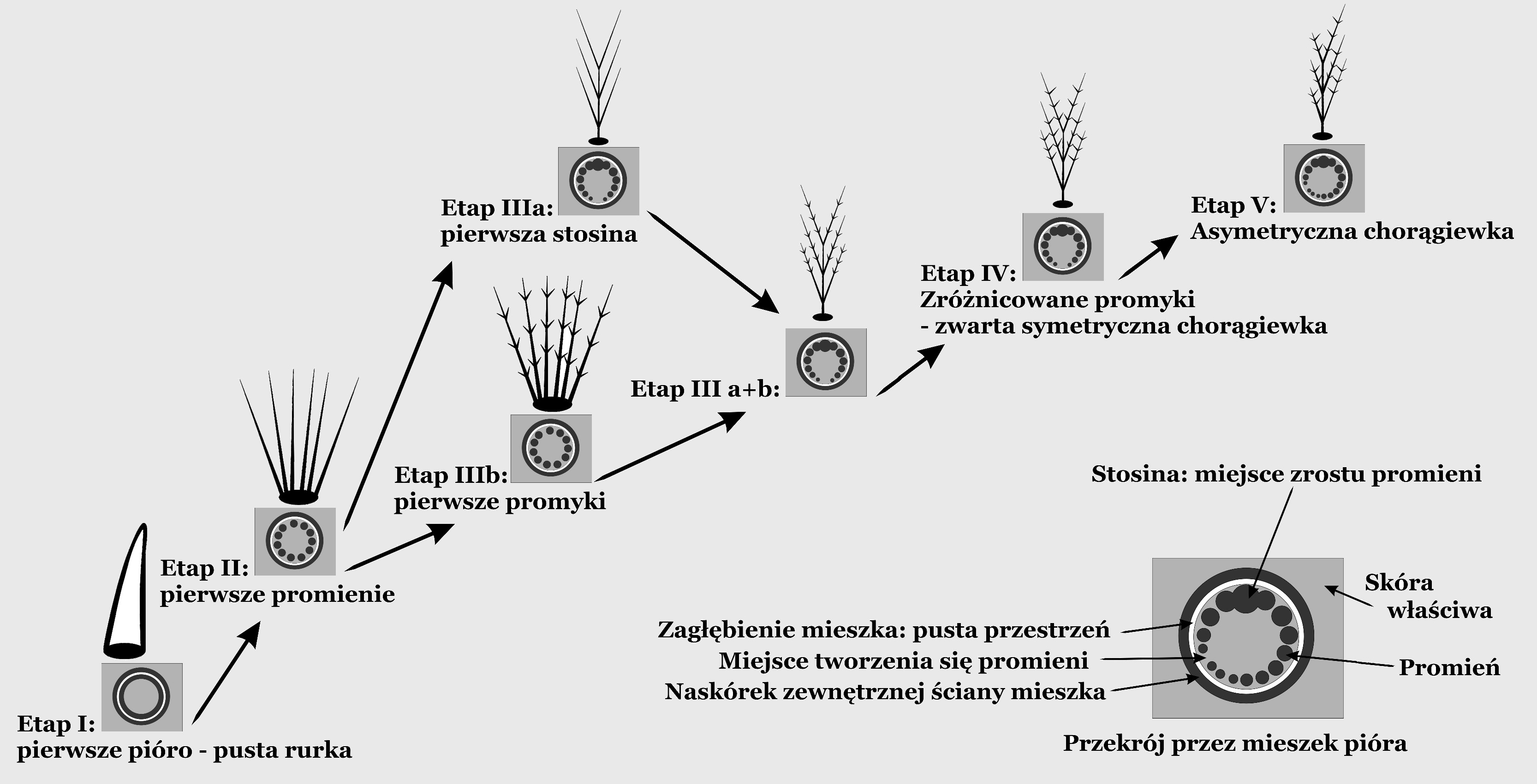 Mniej więcej w tym samym czasie badacze zaczęli do problemu ewolucji pióra podchodzić z nieco innej strony. Teraz zwrócili się oni ku obserwacjom rozwoju ptasiego pióra. Ta metoda badawcza zwana w skrócie evo-devo (z ang. Evolutionary Developmental Biology) doprowadziła do stworzenia modelu ewolucji pióra, który wolny jest od wszelkich założeń i opiera się na obserwacjach rzeczywistych struktur, które pojawiają się w czasie rozwoju pióra. Pierwszym z dwóch głównych wniosków, które płyną z tych dociekań jest rozpoznanie hierarchii budowy w piórze. Zanim powstanie typowe pióro konturowe, np. lotka, musi powstać szereg struktur takich jak promienie, stosina, promyki. Elementy te współtworzą pióro, ale powstają kolejno w wyniku modyfikacji struktur wcześniejszych. W rozwijającym się piórze najpierw powstają promienie i dopiero w wyniku ich zrostu i dalszych modyfikacji mogą pojawić się: stosina i promyki. Na tej podstawie naukowcy byli w stanie określić kolejność ewolucji elementów budujących pióro. Drugim ważnym wnioskiem płynącym z tych badań jest stwierdzenie, że pióro nie powstało w wyniku modyfikacji gadziej łuski i z punktu widzenia ewolucyjnego jest całkowicie nową strukturą okrywową.